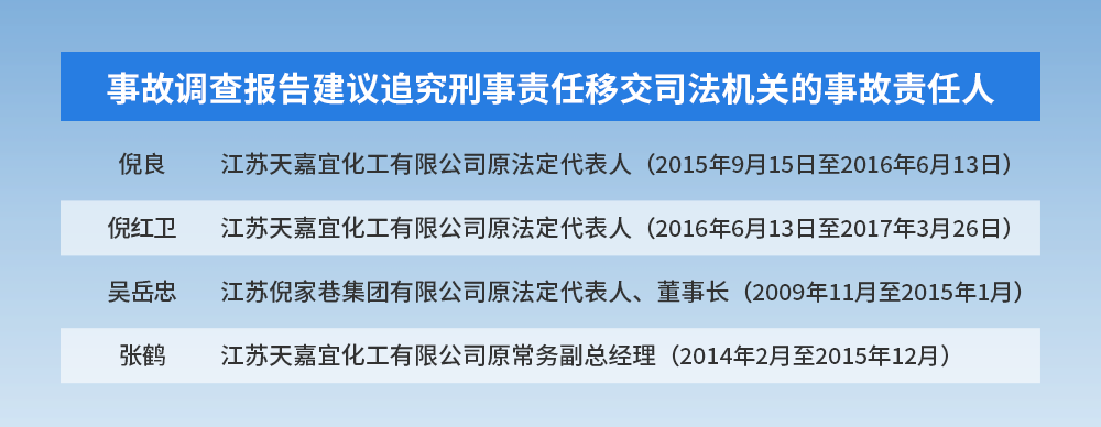 2019年3月21日,江苏省盐城市响水县生态化工园区的天嘉宜化工有限公司发生特别重大爆炸事故,造成78人死亡、76人重伤,640人住院治疗,直接经济损失19.86亿元,107人被问责。江苏响水天嘉宜化工有限公司“3•21”特别重大爆炸事故调查报告建议对天嘉宜化工4位前主要负责人进行追责。