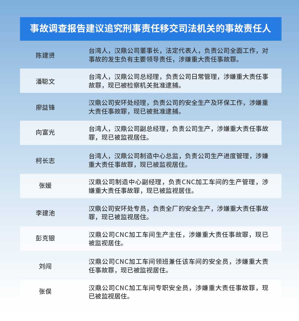 昆山汉鼎爆炸事故追责结果非常令人震惊,前所未见,极具震慑力事故调查报告建议,被移送司法机关追究刑事责任的有董事长、总经理、副总经理、生产部门总监、副经理、车间主任、车间领班(兼职安全员)、安全经理、专职安全员和安全专员等,也就是说,几乎能想到的、和安全生产有关的直接责任人员全部“沦陷”