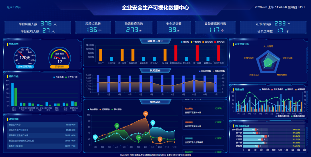 实时呈现安全整体态势,特殊作业、风险单元及巡查情况、预警信息、隐患类型分布、隐患趋势分析、各部门隐患及整改情况、特殊作业、通知速递等数据一目了然,安全生产情况尽收眼底,充分了解安全管理工作的不足及短板,为企业安全目标制定和决策分析提供数据支撑。