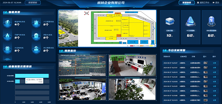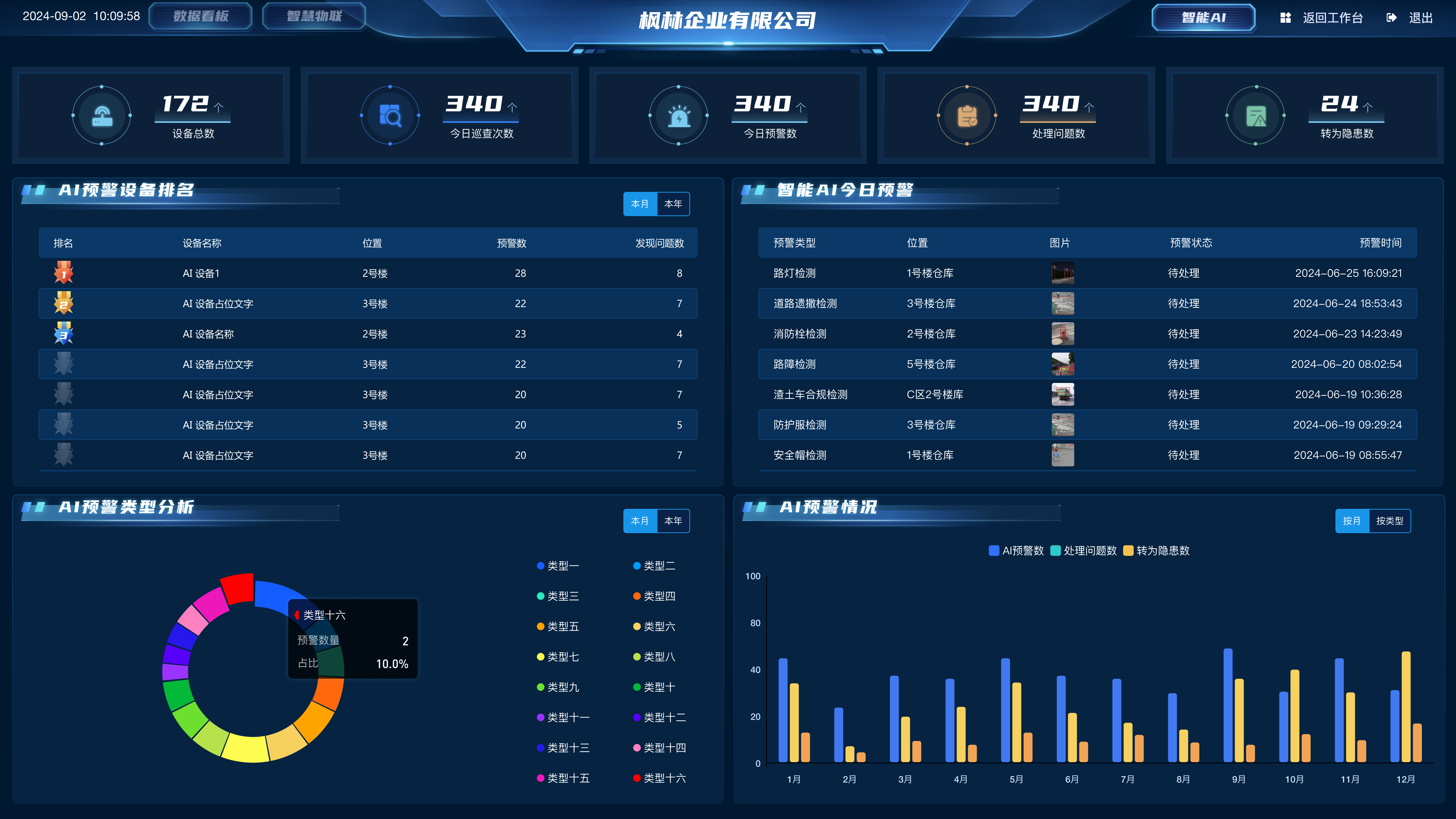 构建可视化数据中心看板集成汇总企业安全生产运行数据,涵盖隐患情况、风险巡查情况、工作完成情况、预警预告情况、到期提醒、物联报警等,便于负责人全盘掌握企业安全管理动态。