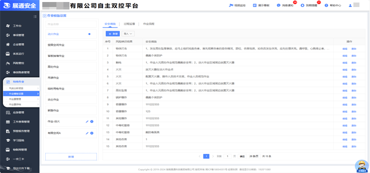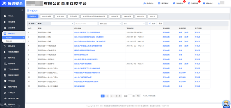 系统提供企业基本信息、安全管理架构、安全投入、涉危情况、行业资质、安全培训、职业卫生、涉尘涉爆、有(受)限空间、第三方检测、检验等15个功能模块,可根据企业实际情况进行选用。